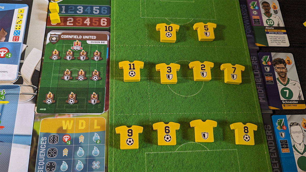 Before I describe the match, I need to briefly pause and talk about goalkeepers. Goalkeepers are not represented by jersey tokens since you always have one. (This is why the formations on tactic and opponent cards only add up to 10, not 11.) If you are fortunate enough to be able to hire a goalkeeper (they are mixed into the Player deck) then you can put them on the pitch and use their ability.