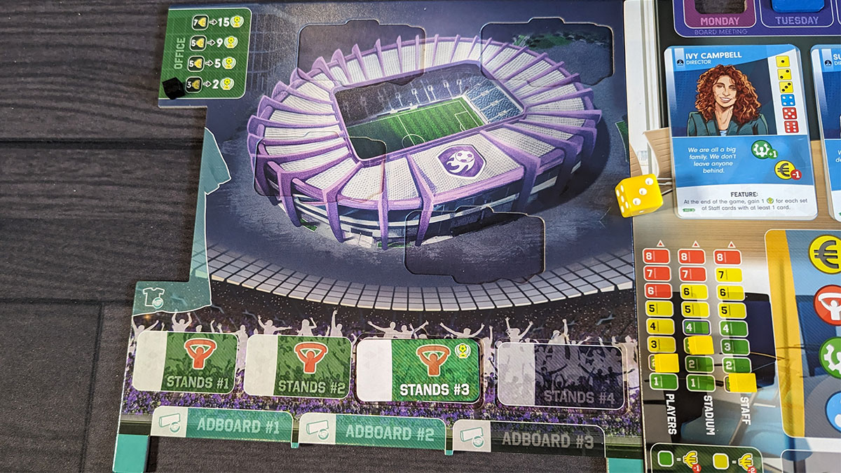 Finally, all players look back at their club board and place the remaining colored cubes on the three maintenance tracks. The exact placement of these varies a bit depending on the chosen directors, but they represent the current number of Players (2, unless a director allows for drawing more right away), staff (1, unless again changed by a director), and stadium infrastructure (4, for the two stands and 2 adboards pre-printed on the stadium board… unless, again, changed by a director card.)