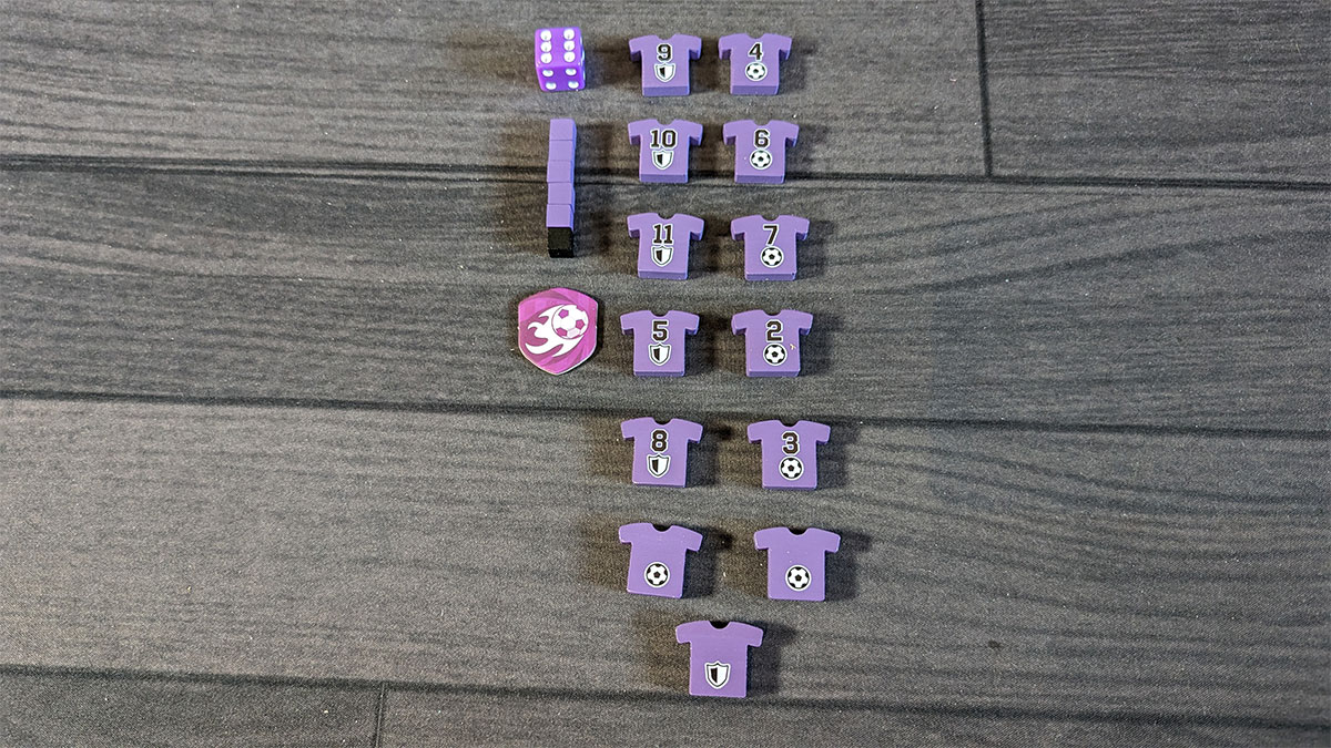 The player-specific tokens consist of colored discs to mark stats (or, in the deluxe edition, colored and shaped pieces), very cool jersey tokens that resemble the actual kit worn by players, and score/maintenance/office markers, which are simply colored cubes. Each player also gets a single d6 in their team color.