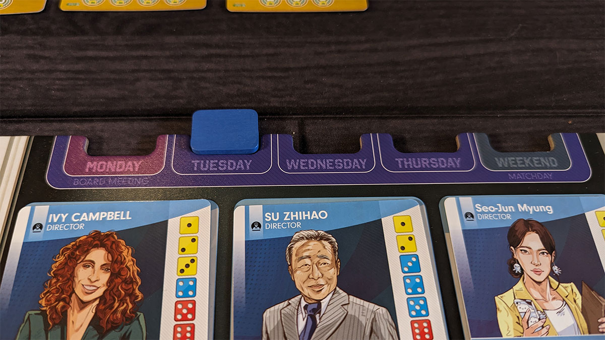 The first player places the stage marker in the Monday space at the top of their club board. The stat markers are placed in the second space of each of their tracks.