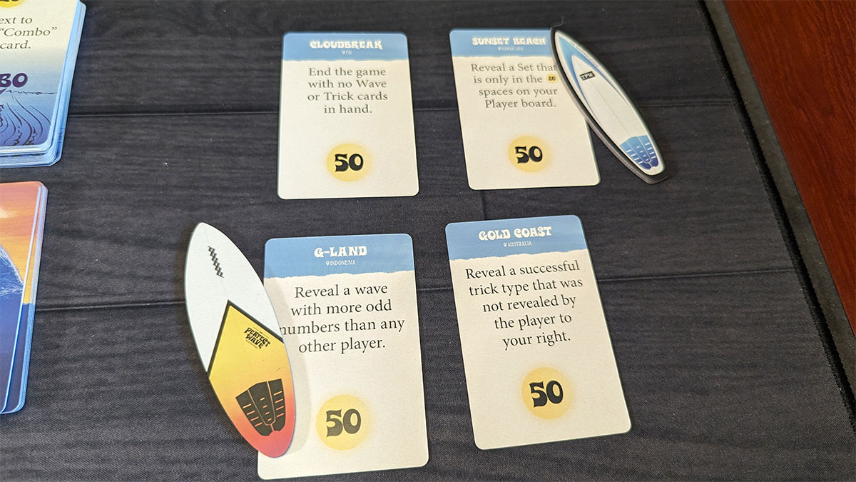 There’s so much strategy packed into The Perfect Wave that you’ll be surprised just how fast-paced it is. Those two actions are limiting, but almost pretty much eliminate analysis paralysis, because there aren’t that many options available in the first place. And for a game with only indirect player interaction, it deftly avoids feeling like “multiplayer solitaire” as well. You probably won’t have enough spare actions to do things like hate-drafting, but you’re definitely going to be paying attention to your opponents’ boards to see how they’re doing on their waves, how many tricks they may be playing, and trying to guess their hidden goal. And of course you’ll need some kind of awareness of what they’re doing if you are planning to activate a public goal. Many of the goals also only score when compared to other players’ waves.