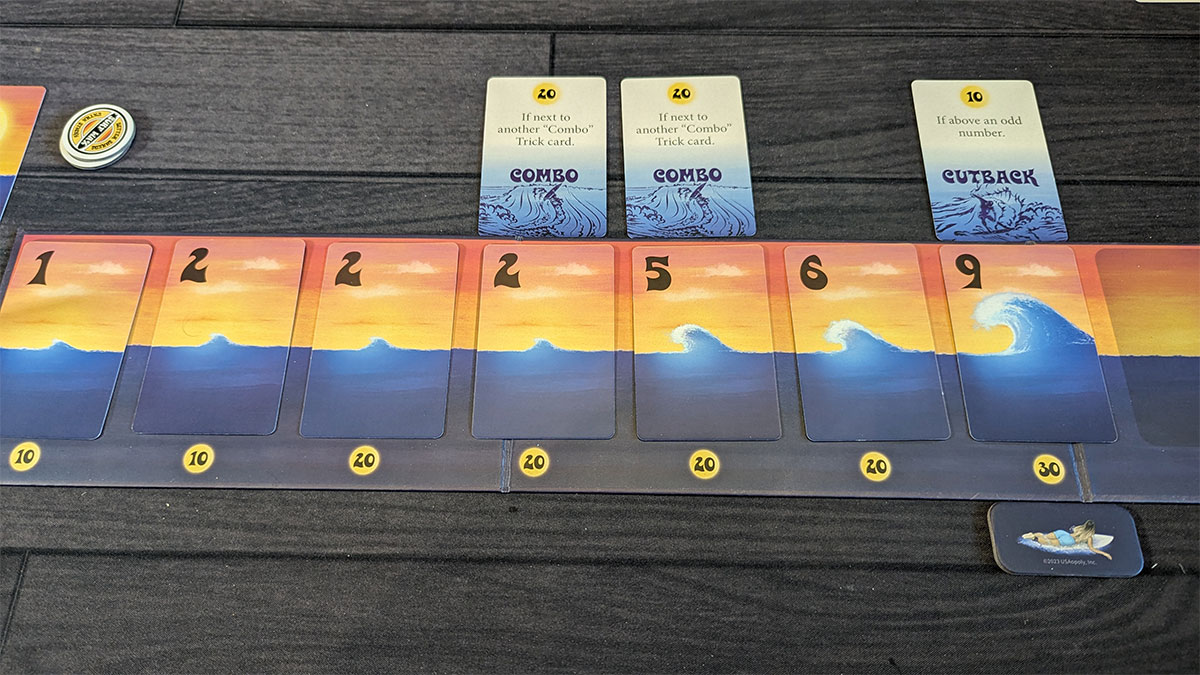 Your wave will start at the card above the surfer and work from there to the left, so the further out your surfer goes, the longer the wave can score. However, wave and trick cards can only be played above and to the right of the surfer, so the further out the surfer gets, the less room you have to play cards.
