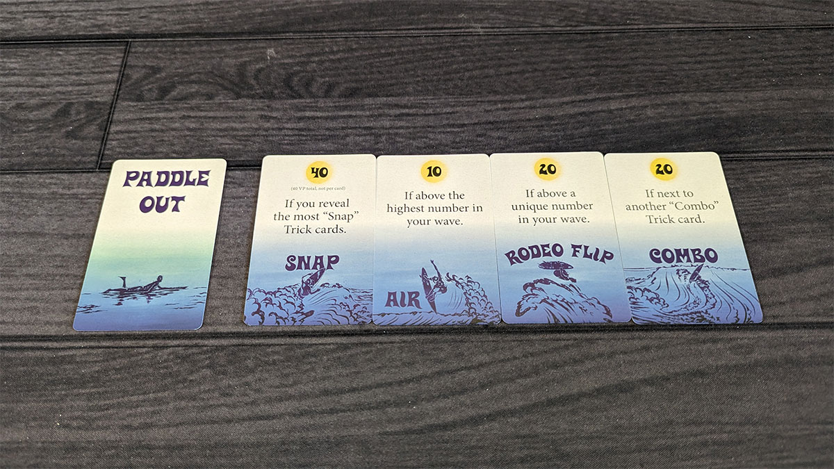 All players begin by discarding any trick cards that are not above a wave card, and any wave and trick cards that are to the right of the surfer.