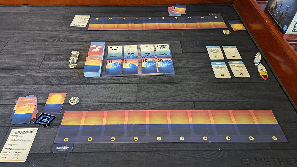 But once you get into the game, you discover quickly that there is so much more to it. Like so many other well-designed games, the two-actions-per-turn at first seems like you’ll have more than enough to do each turn, making even the two-action options seem good. But then you keep running into turns where you wish you could just somehow have one more action. You really need that card on the pier, but you have these two cards in your hand you’d like to play, but oh you’re also running out of time and you really, really need to paddle out your surfer.
