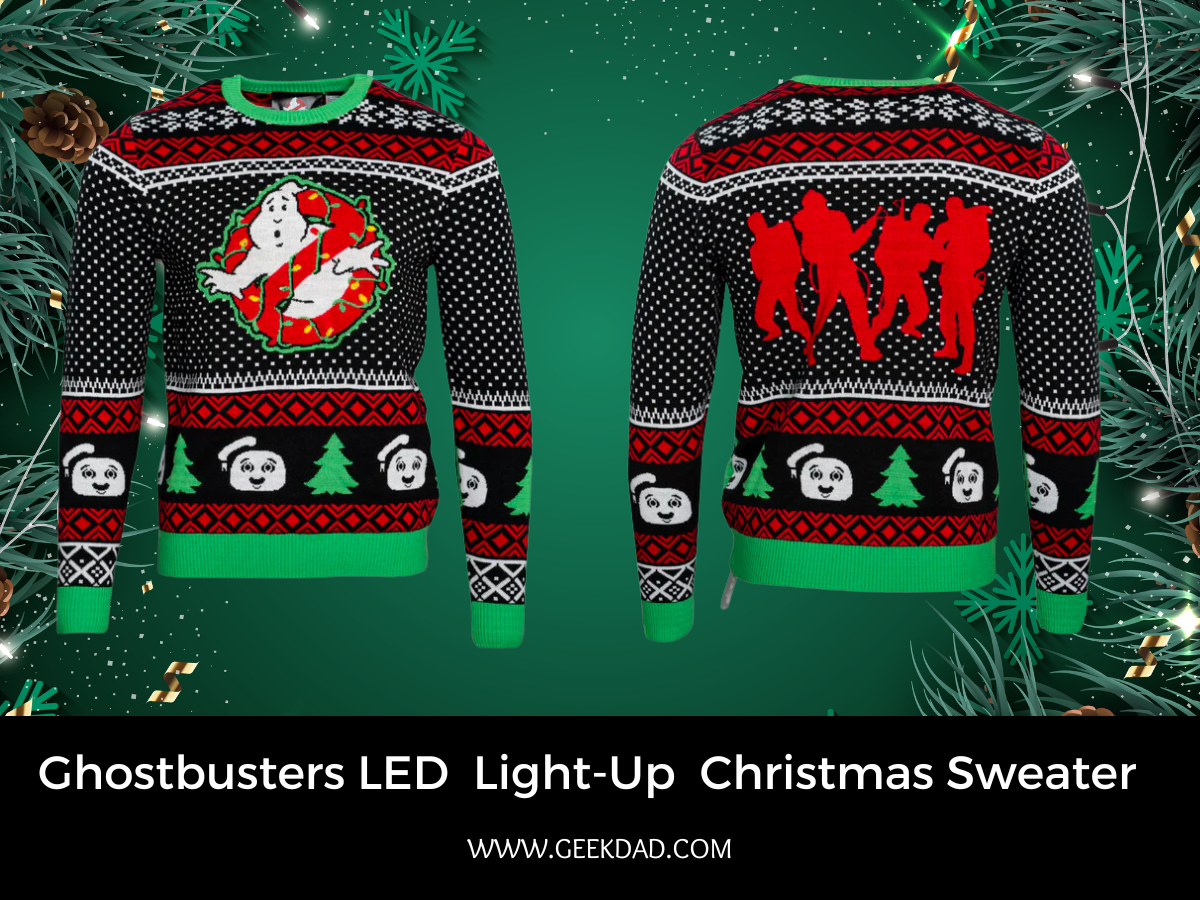 - Ghostbusters LED Light-Up Ugly Christmas Sweater, $59.95 – My husband’s first pick was the Ghostbusters light-up sweater. The neat thing about this one is the battery pack has a little pocket to sit in. Requires (2) CR2032 batteries (not included).
