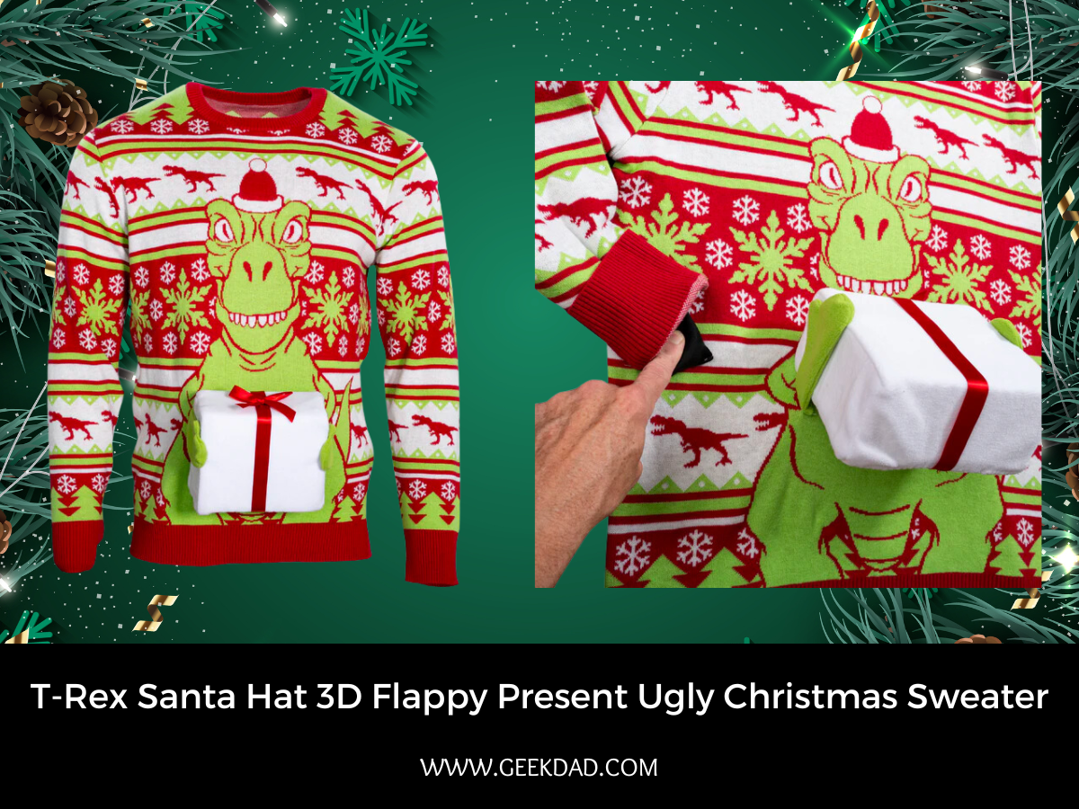 - T-Rex Santa Hat 3D Flappy Present Ugly Christmas Sweater, $69.95 – For some, shaking presents is a fun tradition and this sweater captures that in 10 fold. With a small pump in the right sleeve, you too can shake the present being held by the T-Rex. Can you figure out what he’s getting?