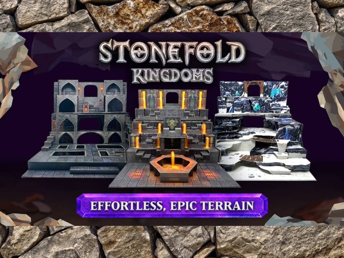 Stonefold Kingdoms: Magnetic Dungeons & Foldable RPG Terrain is an all-in-one terrain solution for fantasy RPG tabletop games. The terrain combines high-density art board and embedded magnets to create dungeons and set pieces quickly. When not in use, the terrain folds up and can be stored within a relatively small amount of space on a shelf.