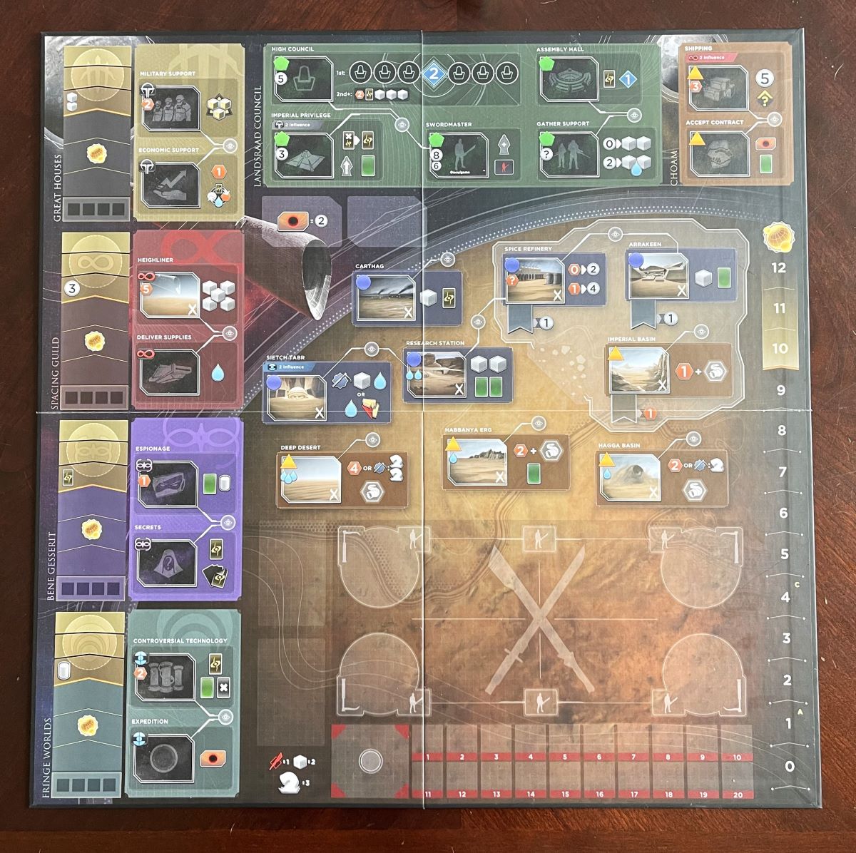 While the game board will immediately look familiar to previous players of Dune: Imperium, there are several notable changes which I will detail in the gameplay section of the review. The board is also double-sided, with one side dedicated to the 6-player team variant. That side has several changes from the 1-4 player side, notably replacing the Emperor and Fremen factions with Great House and Fringe World factions.