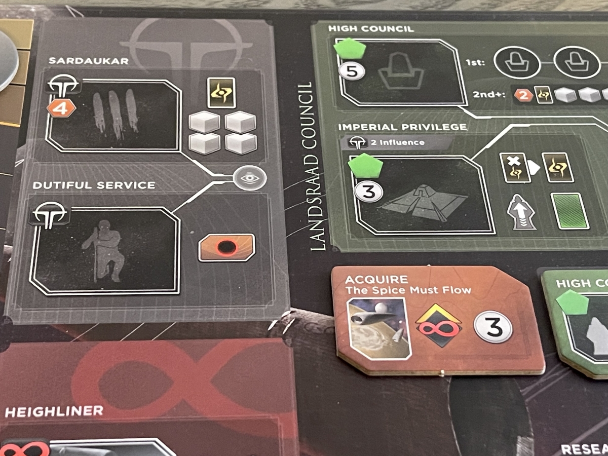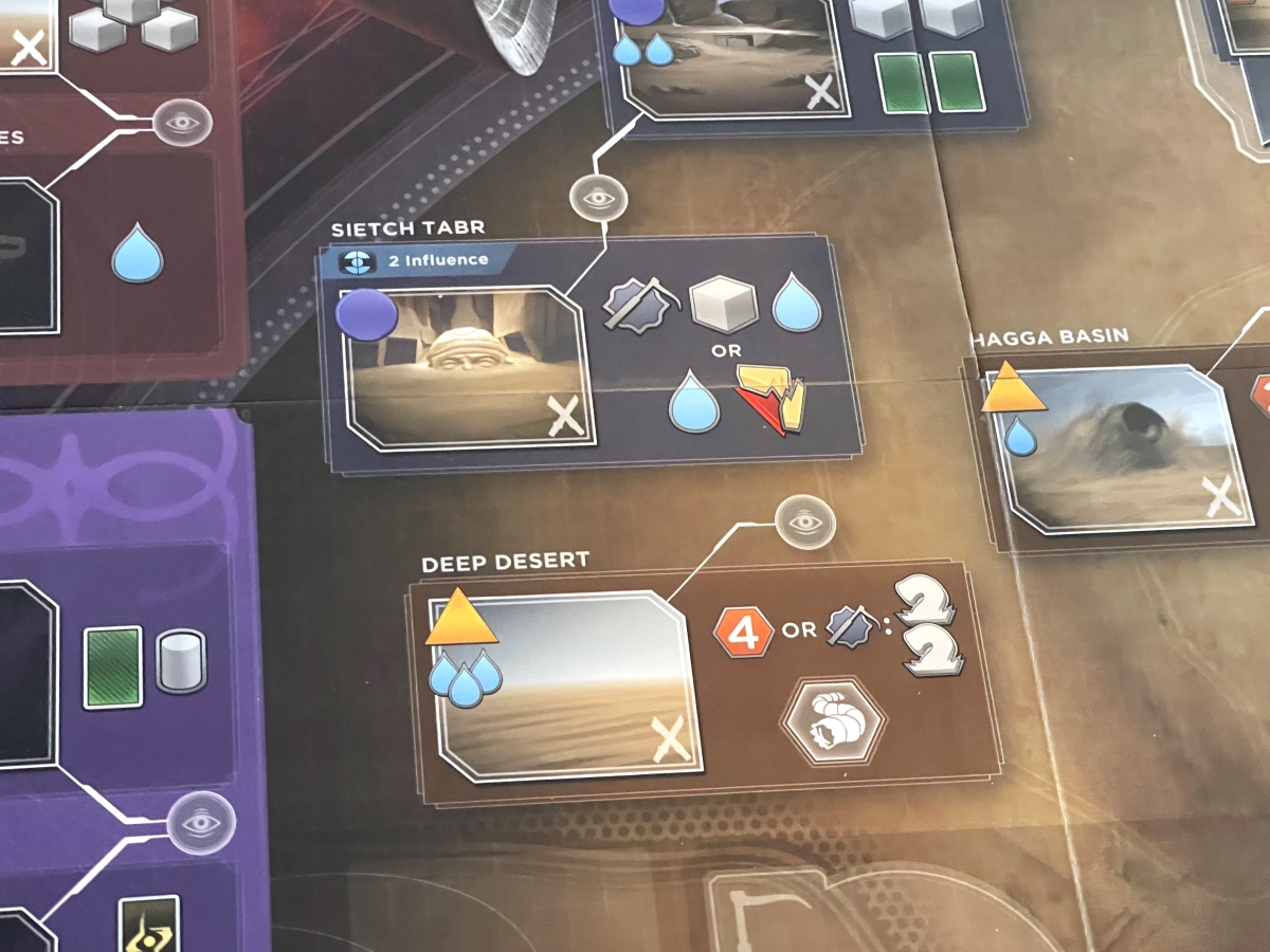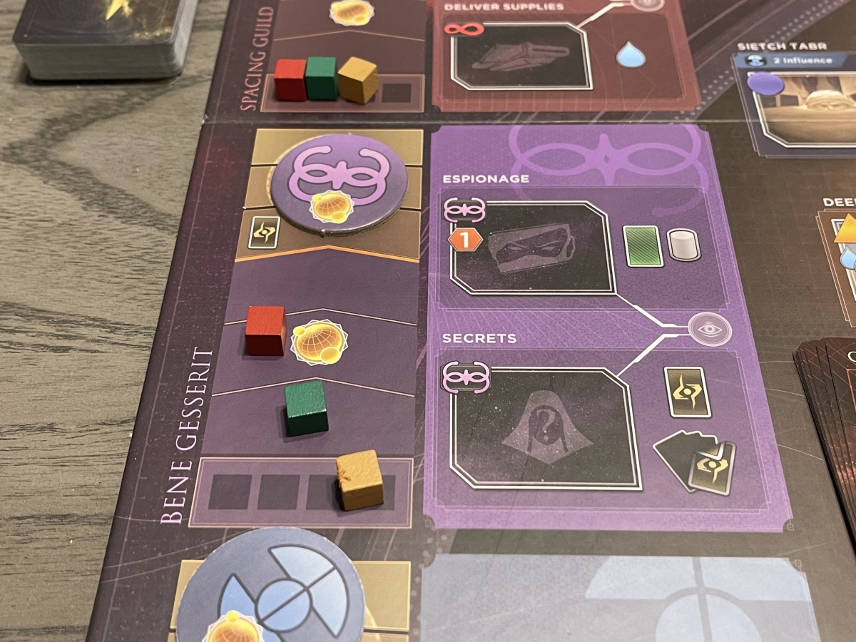 The biggest change from the original Dune: Imperium comes in the form of Spies. Whenever a Spy icon appears on a card (they look like a cylinder) you may place a Spy from your supply onto an unoccupied observation post. These posts are connected to one or more locations on the board, and there are multiple observation posts across the game board.