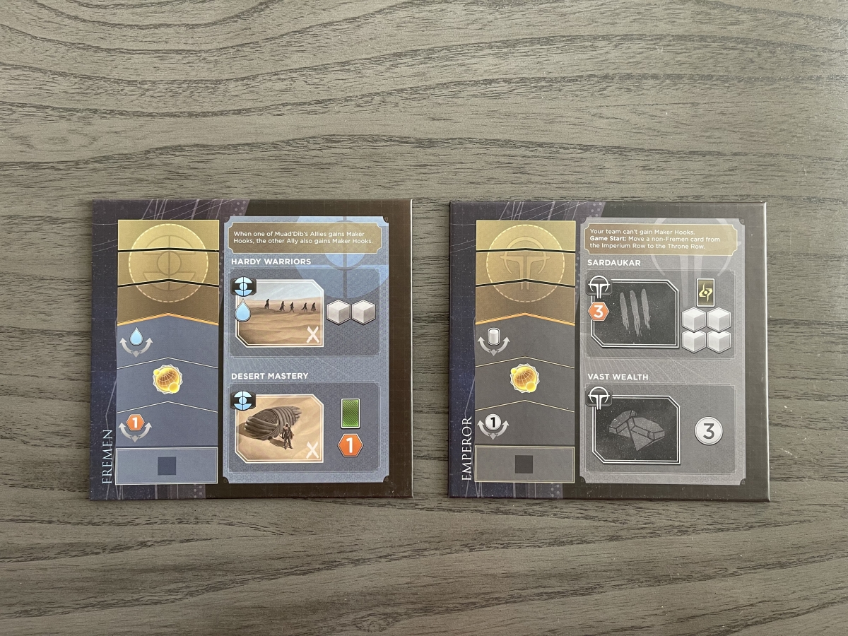 Dune: Imperium – Uprising comes with additional components for both the new six-player mode, and the Rivals solo and two-player games. The six-player games are team games, and players will not choose any of the leaders but instead will be on either the Fremen or the Emperor team. Each team comes with its own unique player board, starting deck, and other components.