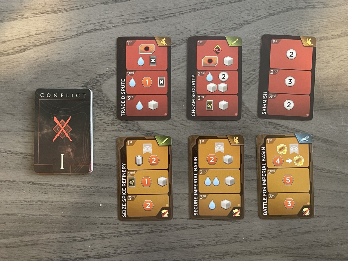 If players tie for first place, no one wins the Conflict, but instead the tied players all receive the second reward. Players that tie for second place receive the third reward. Any players with Sandworms in the Conflict double their reward. Finally, the winner of 1st place takes the Conflict card, and if it matches with another face-up Conflict card they have previously obtained or with their Objective card, then that player gains 1 Victory Point.