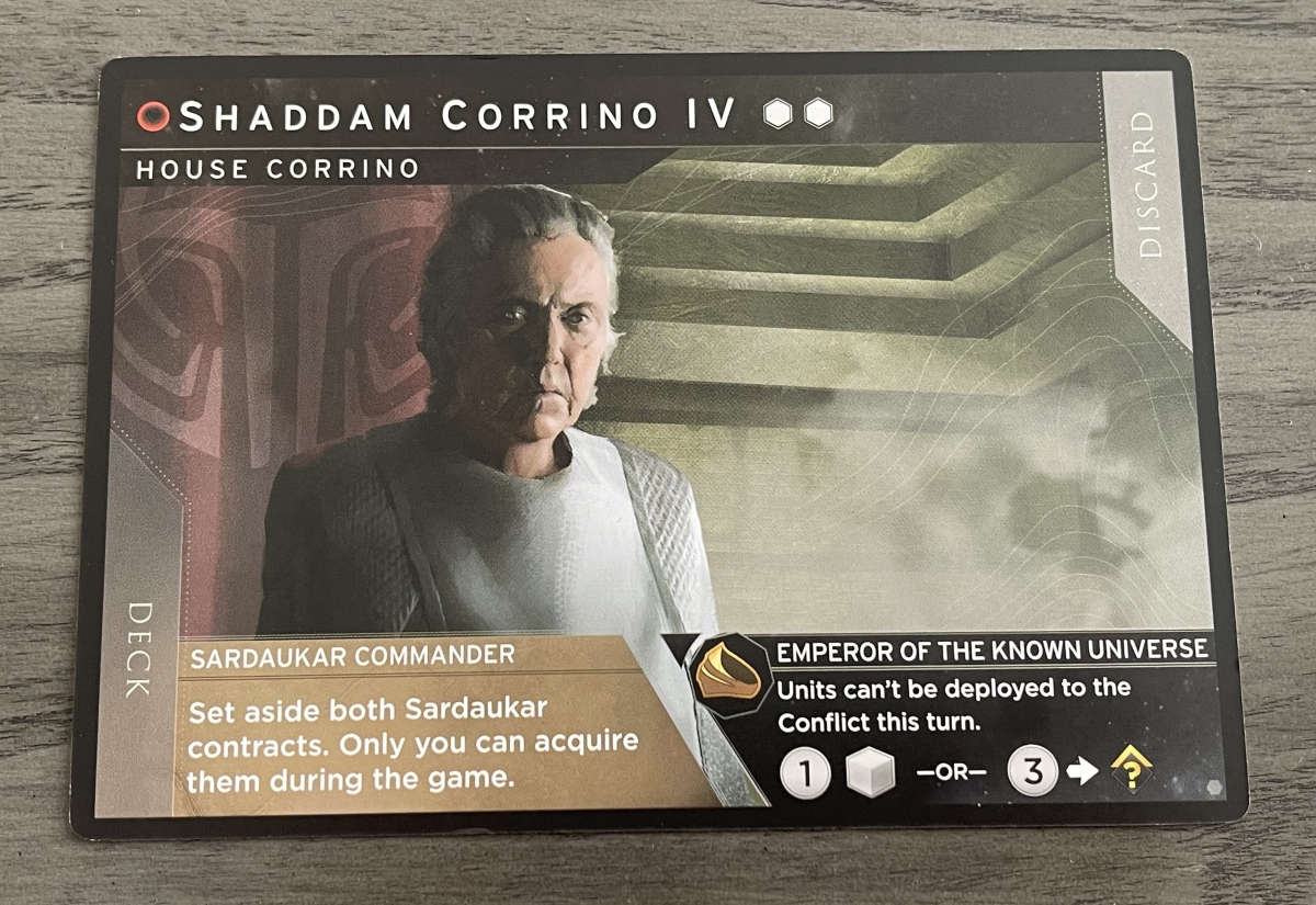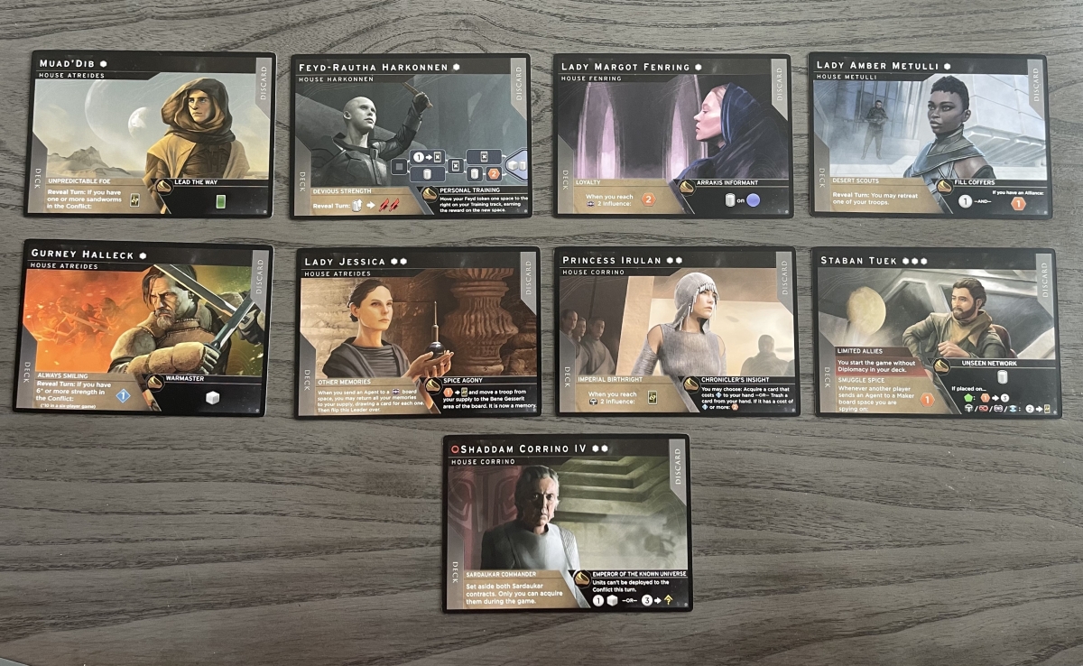 The six-player game rules has two teams playing against each other. Each team has a Commander, and two allies. The Commanders are Muad’Dib and Emperor Shaddam Corrino IV, and their allies can select leaders as normal from the remaining Leader cards. In addition to their Leader cards, during setup the Commanders will also take their respective personal boards.