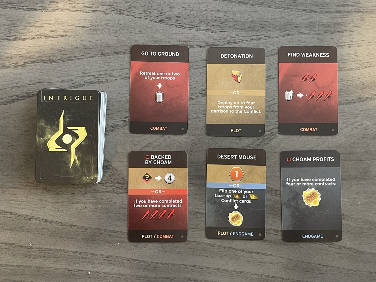 Intrigue cards come in three types: Plot, which can be played during your Agent or Reveal turn; Combat, which can be played during the Combat phase; Endgame, which can only be played at the end of the game. In Dune: Imperium – Uprising, there are also some multi-use Intrigue cards, as you can see below.