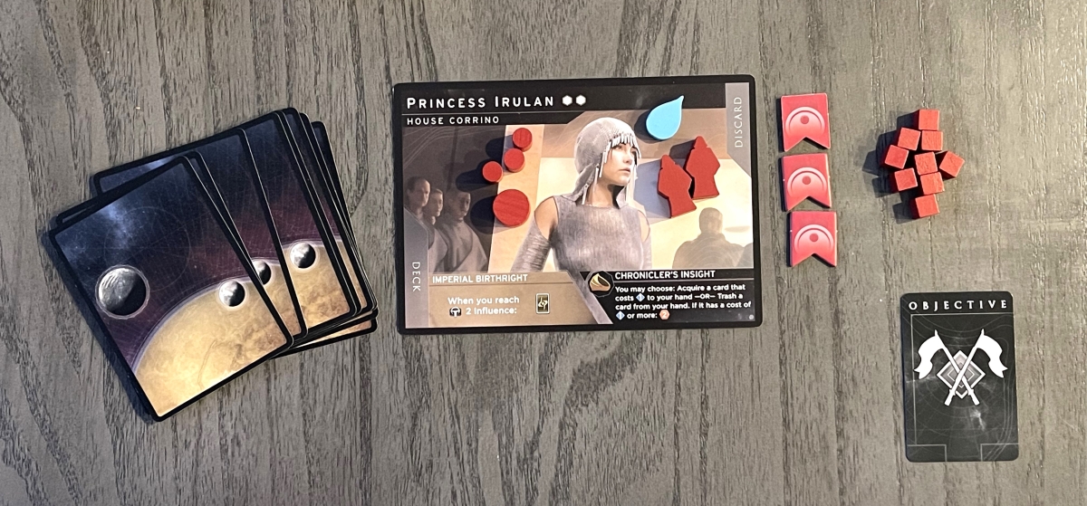 Finally, shuffle the Objective cards, omitting any that don’t match the player count. Each player draws one Objective card at random and places it face-up in their supply. The player whose Objective card shows the First Player marker takes the marker, and will start the game.