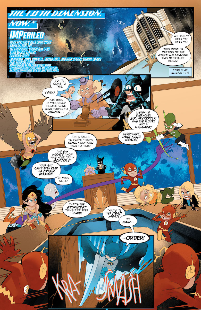 The first story, IMPeriled, by Waid, Bunn, and Galmon, takes place in the chibiverse where Mxyzptlk and Bat-Mite preside over a meeting of the chibi-JLA, which mostly consists of them brawling as they debate which hero is the best, all the while the two chaotic villains try to keep order. That is, until a darker world rather ruthlessly intrudes on this silly environment and reminds them how the real world works. This will continue in Batman/Superman: World’s Finest #25, and it’s great to see Bunn at DC again.