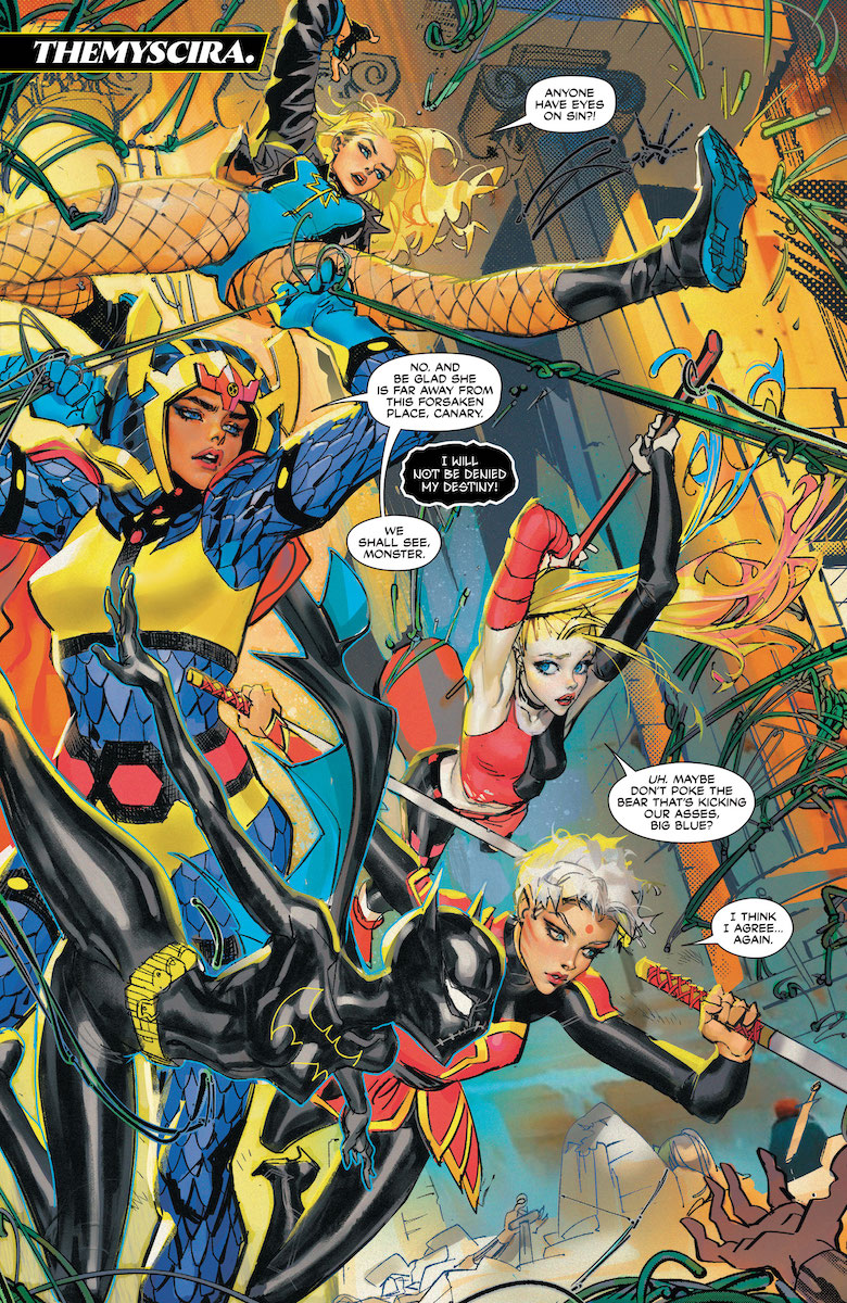 Ray: This has been one of the best books coming out of DC since it started, with an oddball team of heroes and antiheroes uniting for the ultimate mission—breaking into Themyscira to rescue Sin from the Amazons. Or so it seemed, because it turned out the Amazons were trying to guard Sin from the mysterious entity Megeara who had designs on possessing her—and the Birds were picking a fight with the most powerful fighters in the world. After four epic issues packed with spectacular action and great character moments, we come to the showdown with this ancient evil, and it delivers. While the Birds and Sin try to escape, Megeara nearly takes over the entire island, soon sucking Sin within its body. And naturally, Dinah jumps in right in after her, facing off against a God to protect her little sister. The visuals are great, but they’re also very different from what this title usually is.