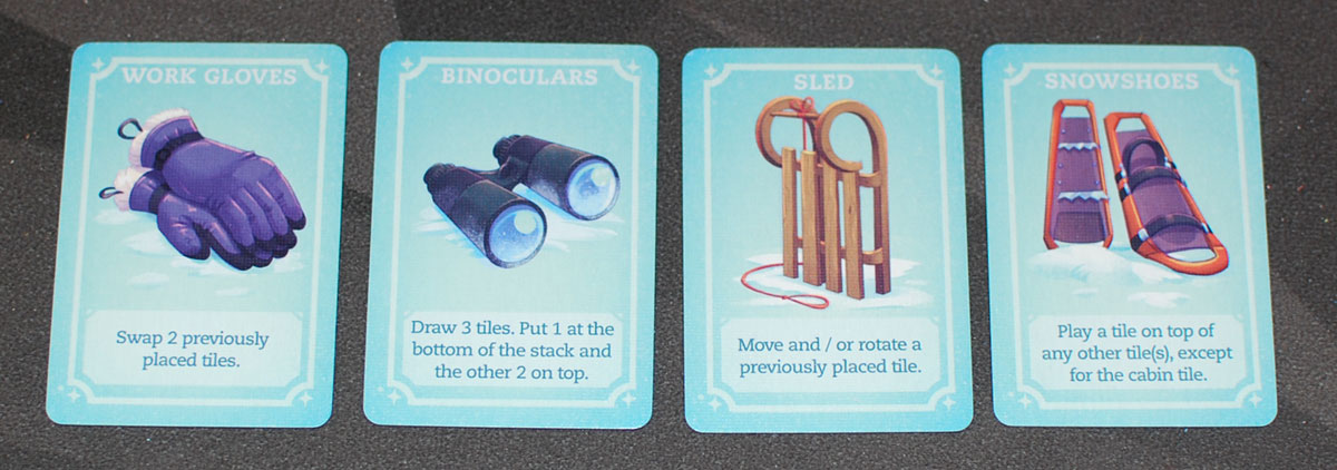 Place the cabin tile in the center of the play area with either side up. Shuffle the rest of the snow tiles and remove 4 of them without looking at them and put them back in the box. Make a supply with the rest of the tiles and draw 2 for your hand.