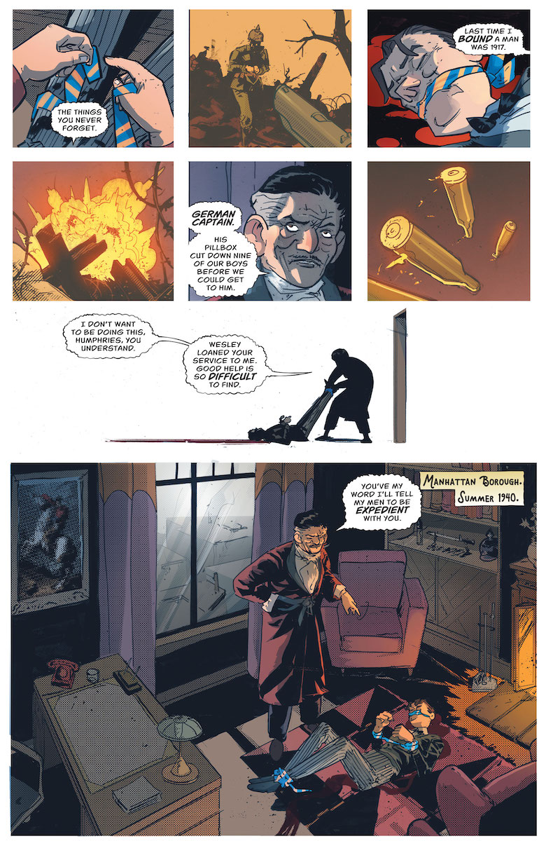 Ray: Venditti and Rossmo have built a slow-burn mystery in this title, as Wesley Dodds operates as an under-the-radar vigilante investigating the theft of his own gas technology in the years between the World Wars and the founding of the JSA. The mystery led him to several targets, ultimately leading him to capture and interrogate his former commanding officer. But the officer who tried to steal the tech and convert it to lethal weaponry was just part of the investigation—and he needed a man on the inside. That led to the reveal that Wesley’s best friend and mentor, Wheeler Vanderlyle (who had just survived an assassination attempt) was the actual mastermind behind the whole plot. And now, as the two old friends face off, it becomes clear how far gone Vanderlyle is—and how far he’s willing to go to ensure the Dodds legacy dies with Wesley and the gas winds up in his hands.