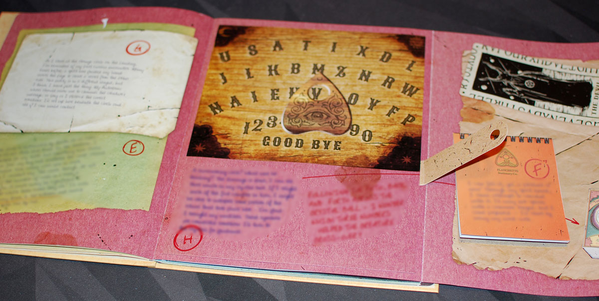 The other big component is the dossier, a hardcover book made to look like a file folder, with one tab for each of the cases. The pages are covered with letters, newspaper articles, “photos,” and more. A lot of the pages fold out, and in addition to the various things that are printed on the pages, there are also a lot of items that are stuck on with glue dots or tucked into pockets: these will often be removed and used in the course of the investigations. The vast majority of these are cardstock or paper, but there are a few other fun surprises here and there. My one complaint about the inserts is that the glue dots used are really sticky—enough so that in the first chapter there were some components that I wasn’t sure we were supposed to remove from the book, and there are some components that ended up getting little surface tears from where the glue dot didn’t want to come off.