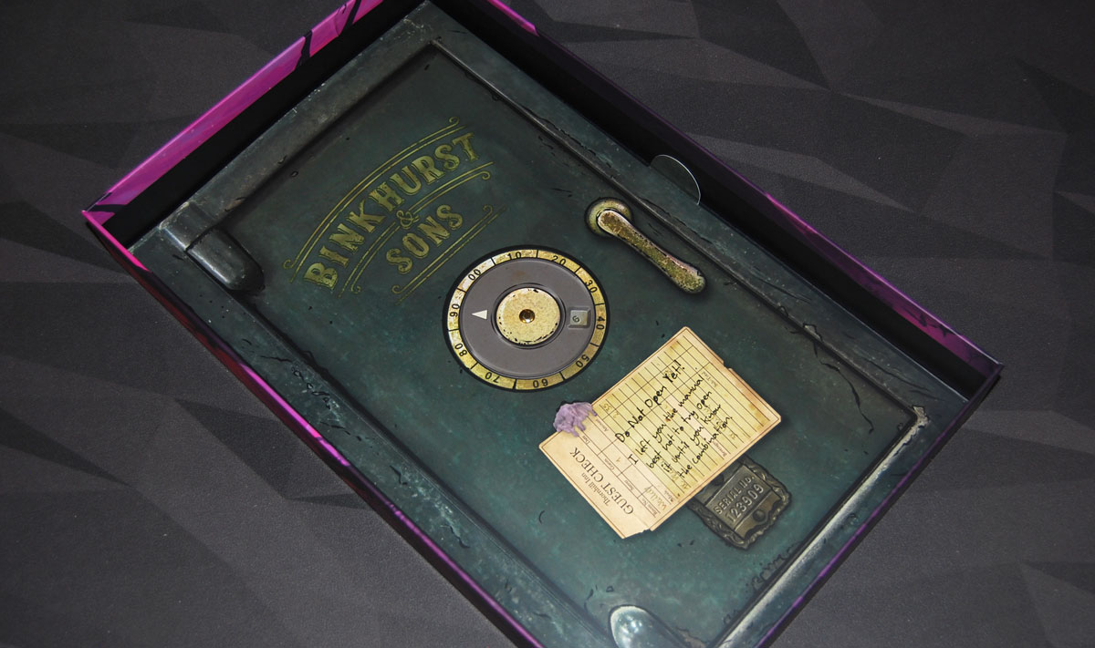 The bottom of the box has a large safe with a rotating dial, and instructions not to open until you know the combination. It’s not really locked, of course—you just pull the tab and it will open—but you should leave it alone until you get to that part of the game. As a fun bonus, the safe shows up in miniature inside the manor itself, too.