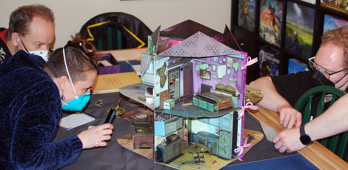 Doomensions: Pop-Up Mystery Manor brings back a little bit of that built environment. The pop-up manor is quite large and has a lot of details. Since you can’t see the whole thing at once, you’ll find yourself moving around (or moving the manor around) to get better angles at things, reproducing the feel of wandering around inside a big house looking for clues. There’s more room for red herrings, but also to spread out the clues. Since the game is actually a series of sessions, you’ll find things that clearly look important, but may be irrelevant to your current case.