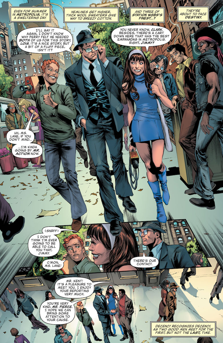 Ray: In what might be the first Superman issue ever written by two different women, DC’s latest Superman: Superstars arc kicks off in a very different way from the last few. This isn’t an event comic or a world-threatening catastrophe – in fact, it’s a flashback, and one in which the main story sees Gail Simone try to get to the very heart of Superman. Set during the WGBS era (which has a distinctly 1970s aesthetic, despite it probably taking place in 2006 given the sliding timescale), Superman, Lois, and Jimmy are helping Jeff Pierce save a youth center during the early days of DC heroes. But that’s quickly interrupted by an alien invasion, in which a brutish alien guard nearly turns Metropolis into a free-fire zone – and a smaller, peaceful alien begs Superman not to engage.