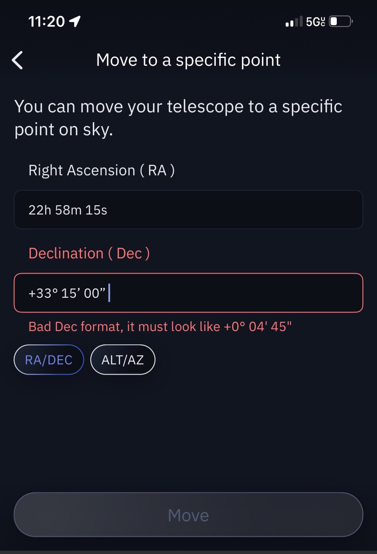 If you’re looking for a particular object that’s not in the database, you can also choose to manually enter the coordinates into the app. On June 29th, a 500-foot-wide asteroid, 2024 MK, was passing close by the Earth. In an attempt to locate it, I checked on an astronomy website and got what I thought was the most recent location in the night sky, and then entered that.
