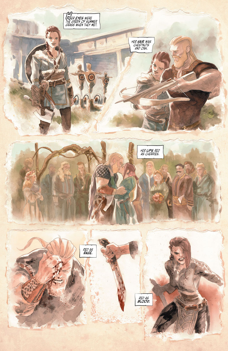 Ray: Tom Taylor’s high-fantasy reinvention of the DCU gave a fascinating coat of paint to some of the DCU’s most famous heroes – and now it’s doing the same to the villains, particularly the ruthless clan of assassins led by Slade. The aged sellsword has been deputized by Vandal Savage to track down a small child with a unique distinction – in a land besieged by a magical winter that has turned everything grey, the child named Alec is in full color. This is a great visual twist, as well as I assume revealing that this is a very different version of the man who would become Swamp Thing. There’s just one major wrinkle in this – the child is being guarded by someone who is all to familiar to Slade. His embittered ex-wife Adeline.