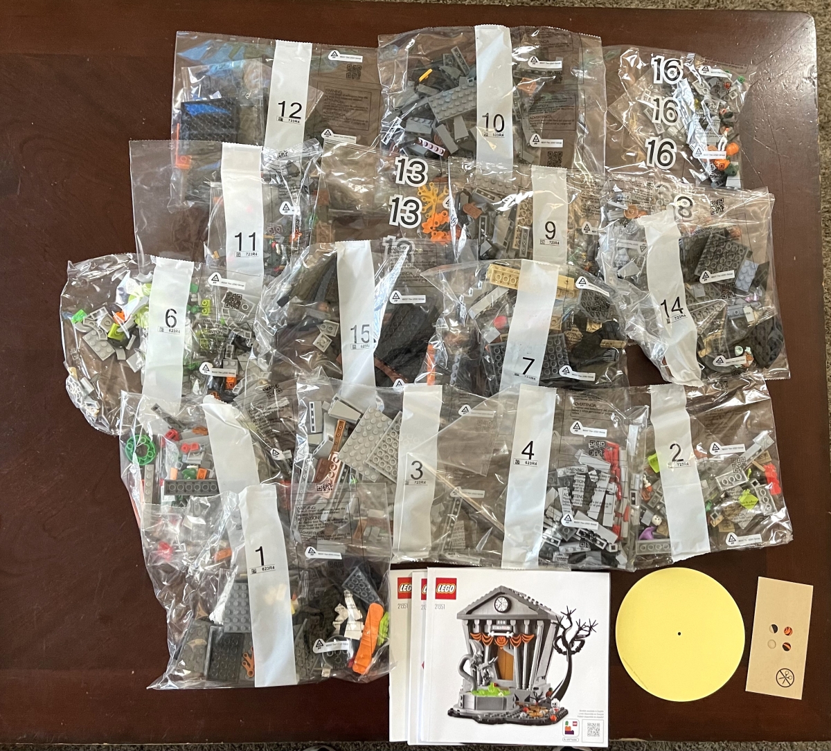 The LEGO Ideas Disney Tim Burton’s The Nightmare Before Christmas has 16 bags of bricks. The assembly spans three books, one for each of the dioramas: Town Hall, Jack’s house, and the graveyard. The first book, for the Town Hall, includes just a couple of pages about The Nightmare Before Christmas film, and the design of the LEGO set.