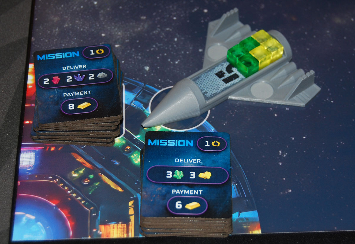 If you dock at the mission center, you may turn in the required resources shown on one of the mission tiles to gain the gold payment, and you also take the mission tile, which is worth 1 point. Remember: you still have to get the gold back home safely!