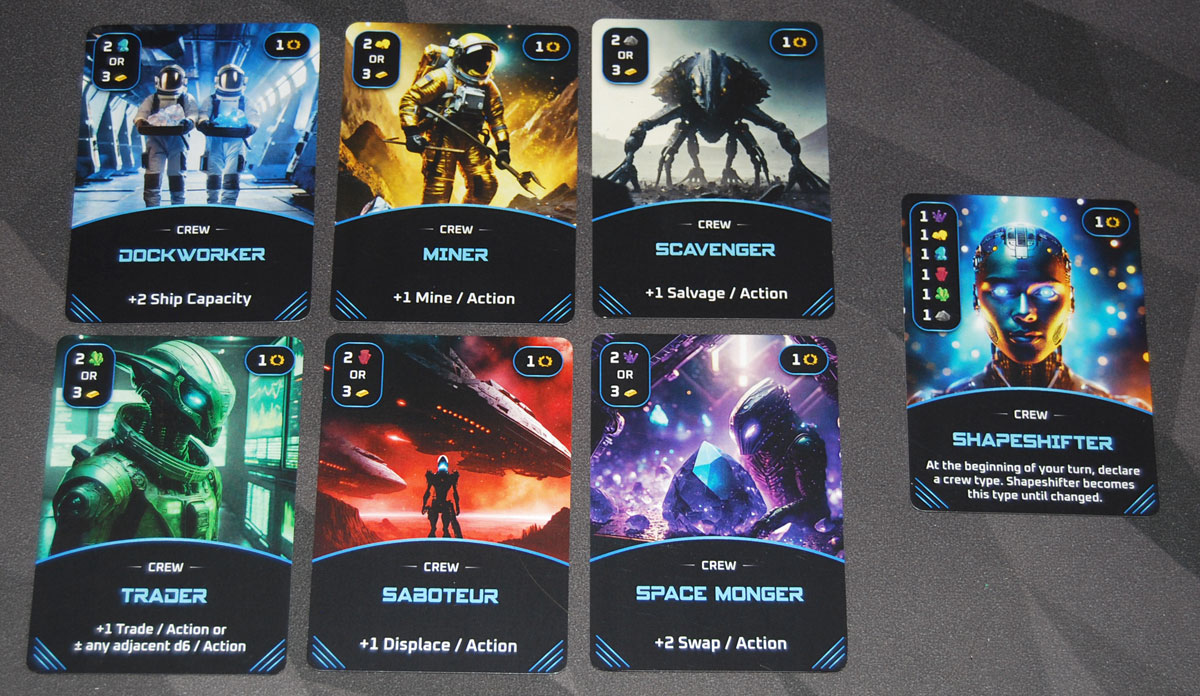 The Shapeshifter is a special crew that is very expensive, but every turn you can decide which crew it is, so it gives you a lot of flexibility. Carrying a lot of cargo? It’s a dockworker this time. Time to mine? Let’s make it a Miner.
