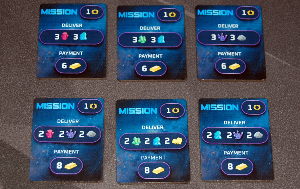 Mission tiles are worth 1 point just for completing them, but also give you a decent amount of gold. The problem is, if there are Spacemongers about, there’s no guarantee you’ll get that gold home to storage. In our games, it was often a dilemma whether it was more efficient to complete missions or trade resources for gold, and one of the limiting factors was always the amount of time it took to fly back and forth between locations.