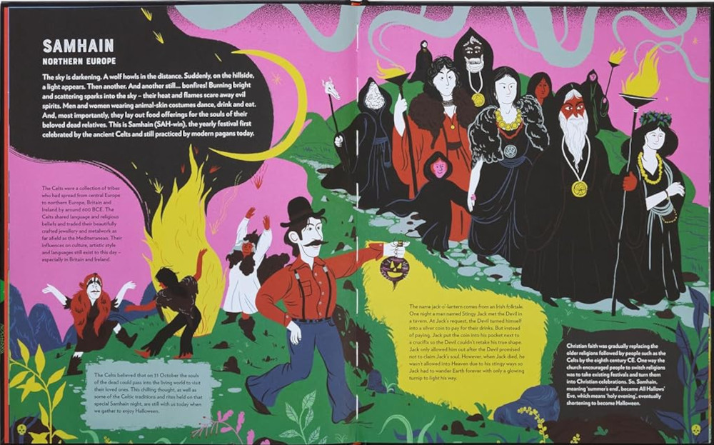 That is just the beginning. Over 48 pages we’ll be treated to full double-page spreads from 21 different places including spooky traditions from China, Wales, and New Zealand. At the back, there is even another two-page spread with 10 more spooky celebrations to learn about.