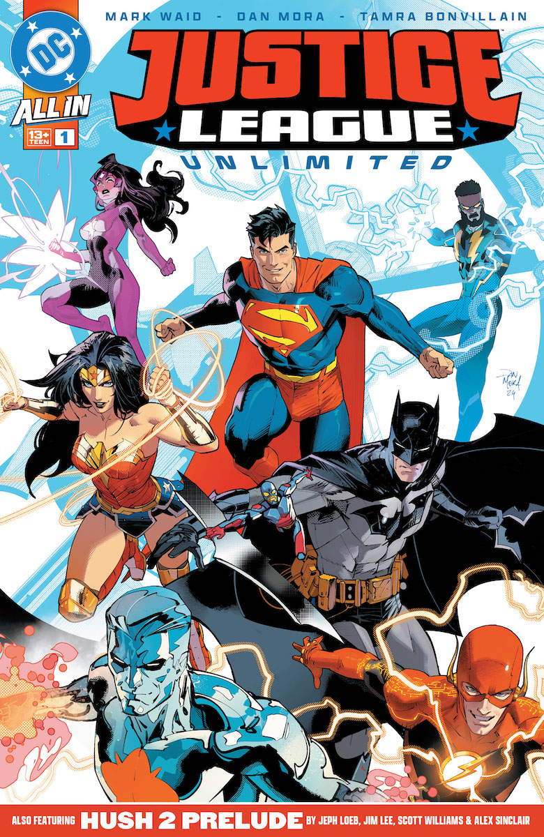 Justice League Unlimited #1 – Mark Waid, Jeph Loeb, Writers; Dan Mora, Jim Lee/Scott Williams, Artists; Tamra Bonvillain, Alex Sinclair, Colorists