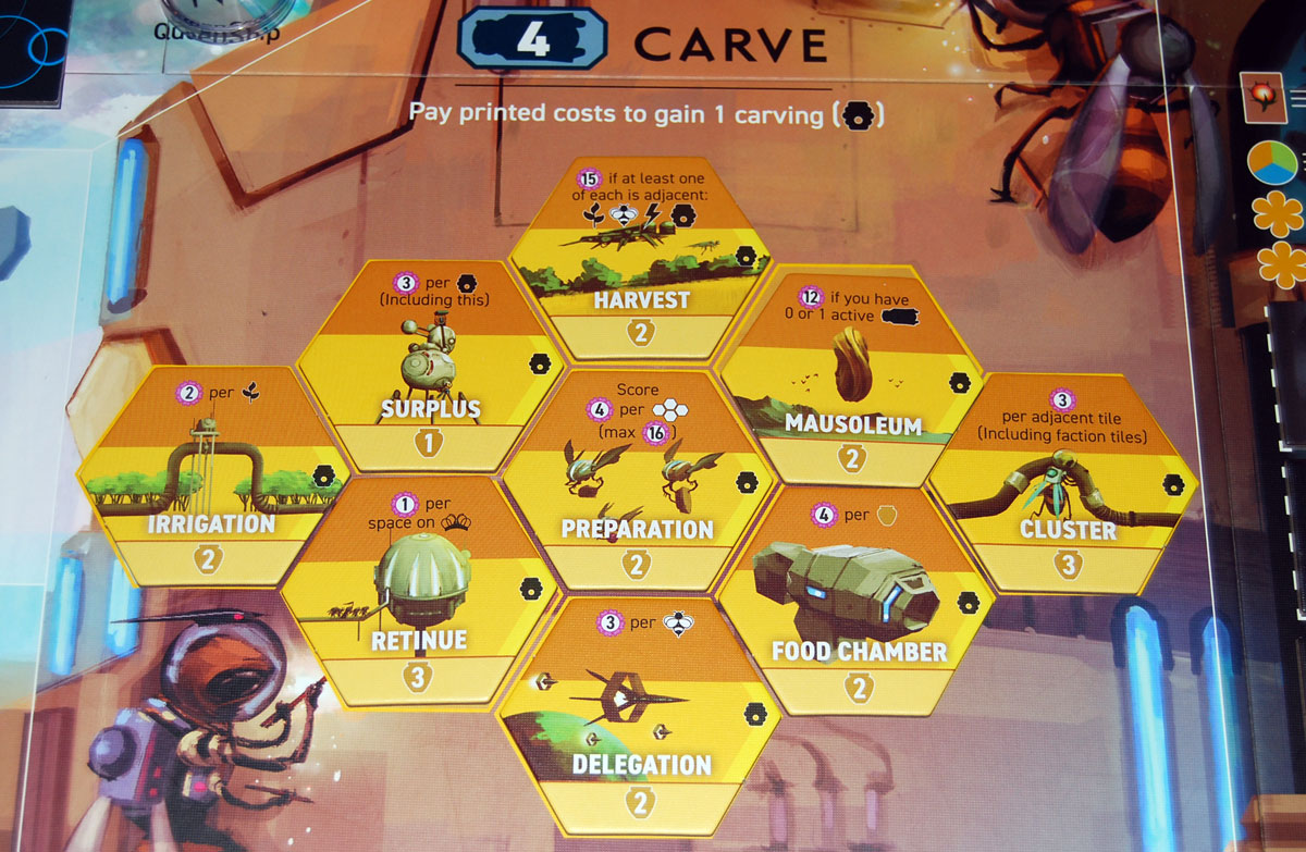How quickly you burn through your workers and send them into hibernation is also an important tactic. The Hibernation Comb has various bonuses, so there can be a bit of a race to get the good spots. More importantly, there are bonus points awarded for having the most (and sometimes second-most) tokens in each section, so there’s an area control game happening there. However, hibernation is also what triggers the end game—aging and hibernating your workers accelerates the game, and may not leave you enough time to pursue other things like expanding your hive or fulfilling your carvings and seeds requirements. Also, whenever you hibernate, you lose a worker, so then you’ll have to spend some turns using Grow to get new workers.