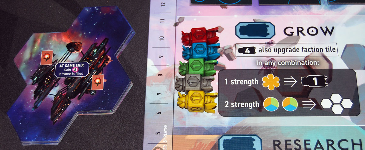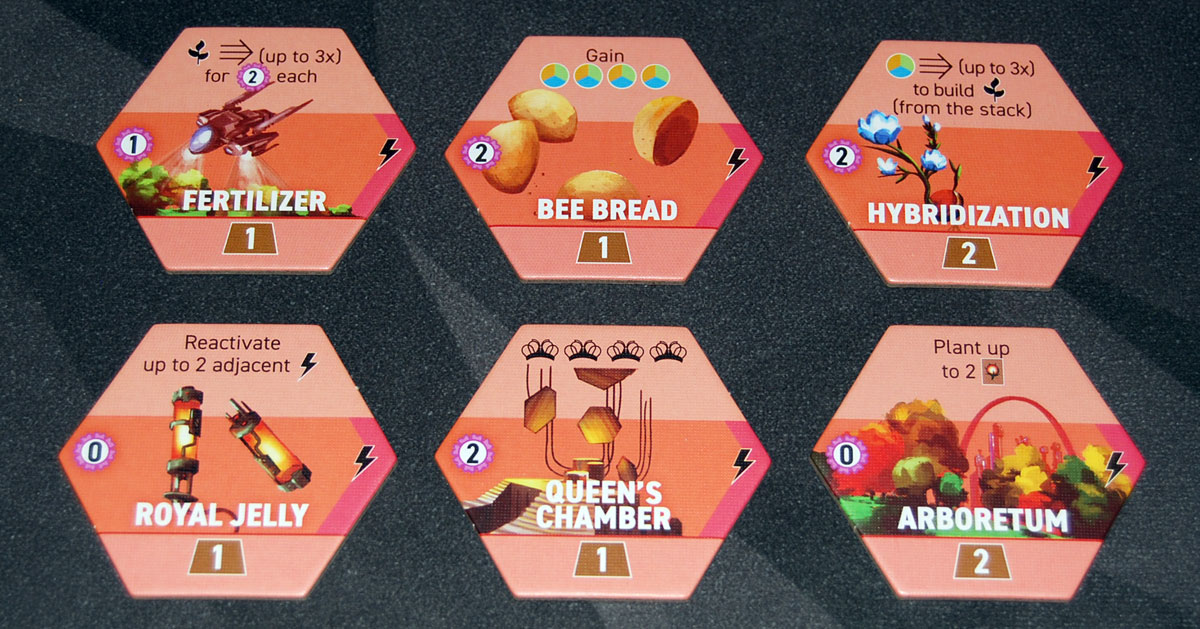 With all the different types of actions and ways you can get points, Apiary gives players a lot of flexibility in what strategies to pursue. My group hasn’t really pursued a farming strategy, but I’ve definitely seen effective ways to use recruits to upgrade favorite actions, lots of research to get seed cards for their powerful effects, or using development tiles for their bonuses. (The Royal Jelly development tile, shown in an earlier photo, lets you reactivate two adjacent development tiles, which is extremely powerful if you’ve planned out a good spot for it.) Exploring early in the game gets you those exploration tokens, and also lets you control what resources the planets are producing. Plus, generating a lot of resources means you may be discarding them for Queen’s Favor, which can award a whole lot of points as you approach the end of the track.