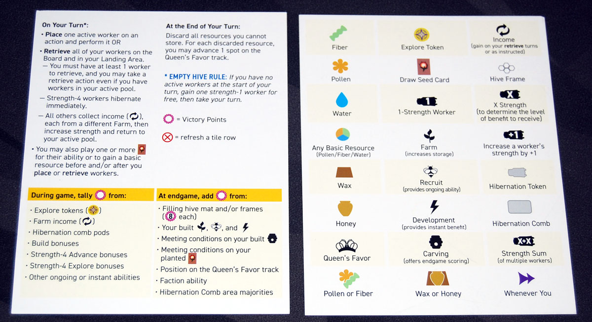 The player aids are large cards that capture a lot of useful information in one place. One side has a lot of text: a reminder of what to do on your turn and at the end of your turn, and then lists of ways you can score points both during the game and at the end of the game. For new players, it’s a good reminder of all the ways you can score points because there are so many. The other side of the player aid shows all of the various icons used in the game—one important distinction is that the solid black bee shapes represent the actual workers, and the grey bee shape represents the hibernation token.