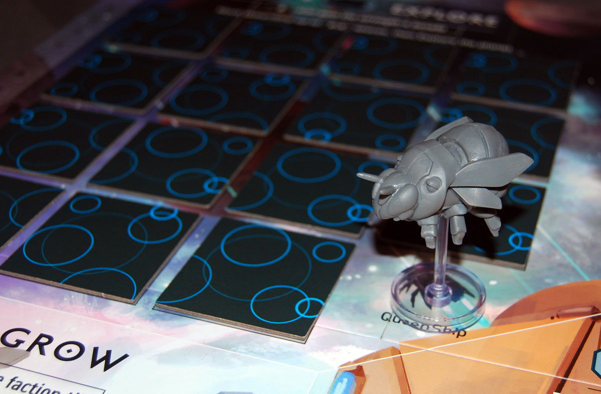 - Face-down exploration tiles with randomly placed face-up exploration tokens, and the QueenShip in the bottom corner of the Explore grid.