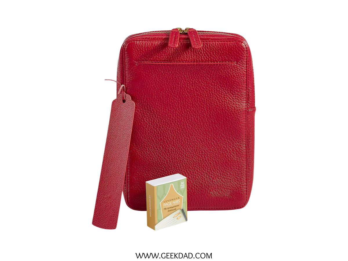 The Levenger Leather Bookmate makes for an elegant holiday gift, offering book lovers a luxurious way to keep their books safe. I love the classic red color, the bonus leather bookmark, and 50 page nibs. It comes in at 7W x 1.75D x 10H, which makes it a nice size for the average book. –D.S