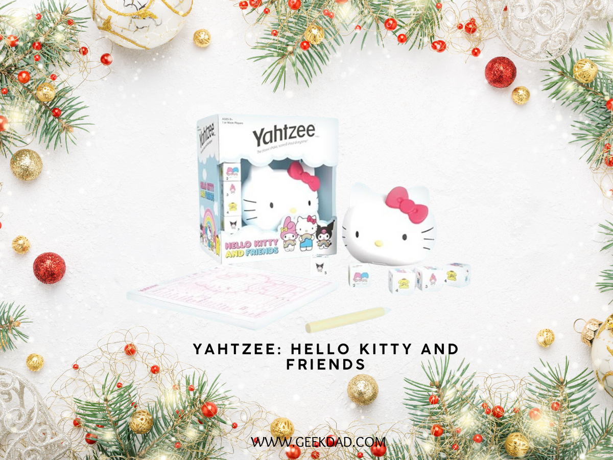 For something that has become so ubiquitous in popular culture, there can probably be such a thing as too much Hello Kitty, but for us, this version of Yahtzee is spot on it’s theming. The Hello Kitty and Friends Yahtzee dice game leans heavily on the classic Sanrio character, featuring a collectible dice cup in the shape of Hello Kitty’s head, but the dice incorporate other favorite characters such as Pompompurin, Kuromi, and Cinnamoroll. My kids loved the character play, my middle aged brain was glad that the dice also included numbers! Great for Yahtzee fans, or Hello Kitty fans, and probably a great way to confuse any grandparents willing to play! – S.P
