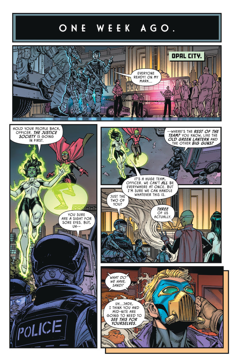 Ray: The first issue of this thrilling series kicked off in a big way – with the JSA split across dimensions. The old guard was trapped in the Tower of Fate along with Khalid, trying to make sense of an even more confusing version of the eldritch location. And on Earth, an ad hoc version of the team led by Jade tried to keep order while dealing with growing conflict on the team – primarily led by a ruthless Obsidian. Or did it? The cliffhanger revealed that Obsidian wasn’t Obsidian at all, but Johnny Sorrow, who had taken the shadow master’s place during the initial attack and was now leading a team of the JSA’s most iconic villains against them. This is the first time we’ve really seen the equivalent of an “Injustice League” for the JSA, and the roster we saw was a particularly intimidating one with some big unanswered questions. But now, it’s time to flash back and see how we got here.