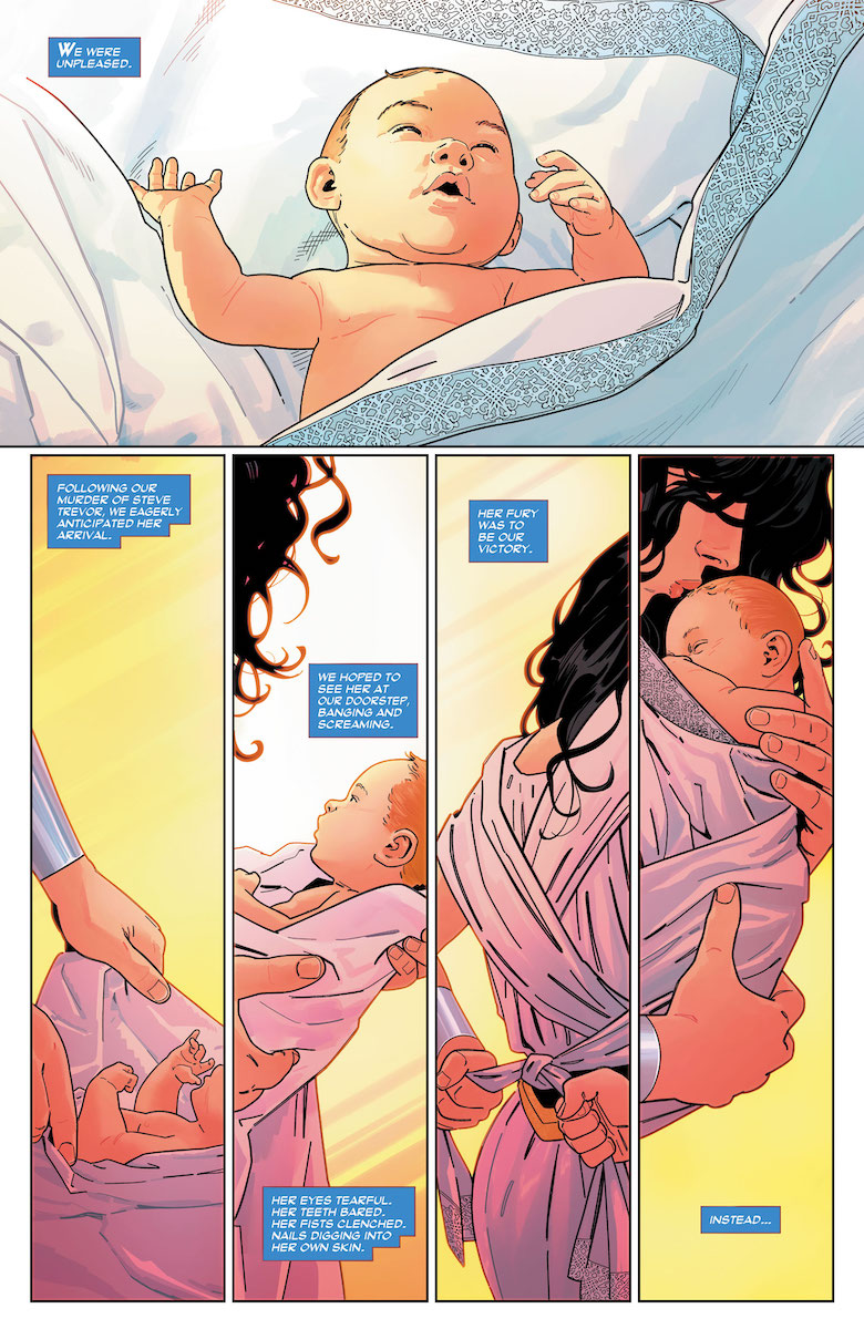 The thing about Detective Chimp is that he absolutely does have a chimp’s brain in some ways – he always carries a banana with him! – but he also has a mind that would make Sherlock Holmes think twice about challenging him. We see that unfold over the issue, as Sovereign goes from annoyed to worried as Bobo gets closer by the day. In the end, he manages to unravel something that goes far beyond just the murder that was committed. And while this is going on, there’s a brilliant segment as Diana heads to Olympus to mee with her mother and introduce her to her grandchild. This book is tapping into something really unique about the nature of life and death, and it might just go down as King’s crowning achievement.