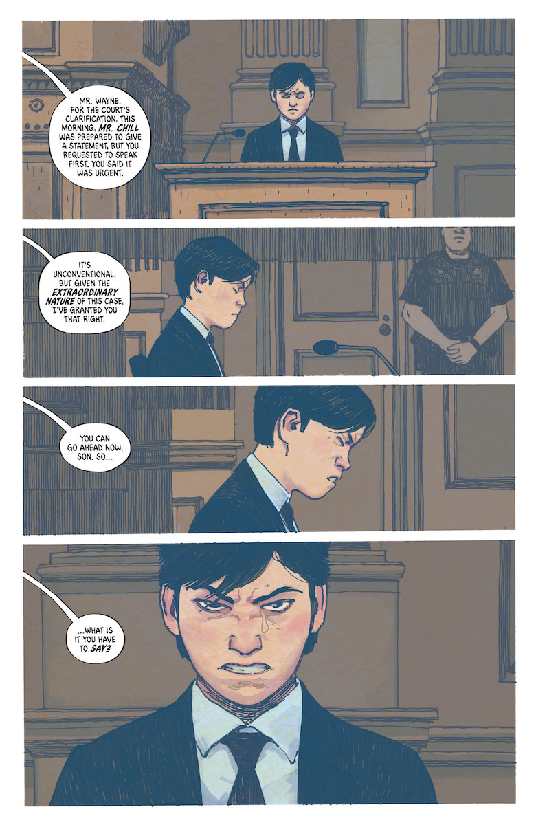 Some of the most powerful scenes of the issue take place in the courtroom for Joe Chill’s sentencing, as we see Bruce in a raw state of anger that’s hard to portray effectively but done brilliantly here. But the thing that takes this issue to another level for me is that for the first time, we see Batman built as a form of trial and error. The very first Batman we see Bruce try is one based entirely around terror, with a vicious vampire motif and even the use of a gun. And he very quickly realizes it feels wrong, as does focusing on low-level crime. As he starts to work his way up the totem pole to discover who’s truly bringing violence into Gotham. We get some hints at a larger villainous conspiracy here, as well as some great action as we see our Batman in action for the first time. But while Walta’s guest art is brilliant, what really makes this issue so strong is how effectively it gets us into Bruce’s head as he comes of age – and uses his pain to become something we haven’t seen before.