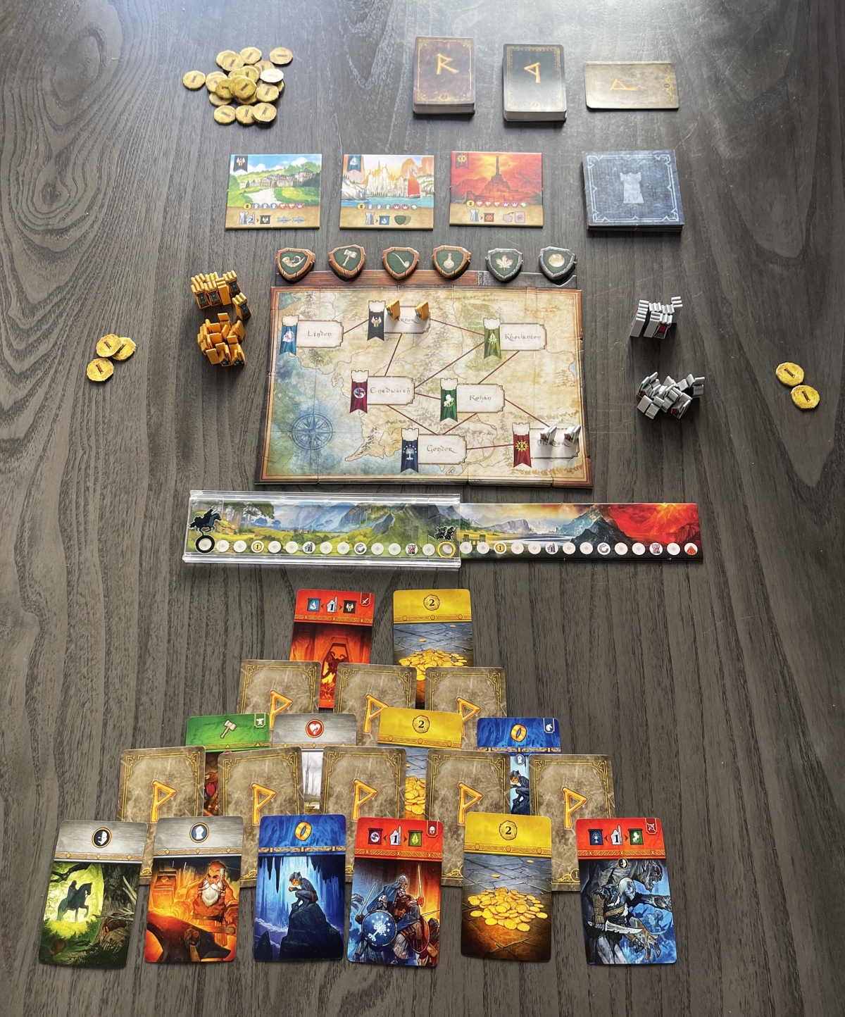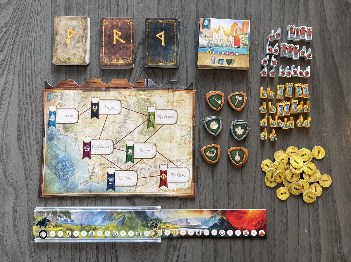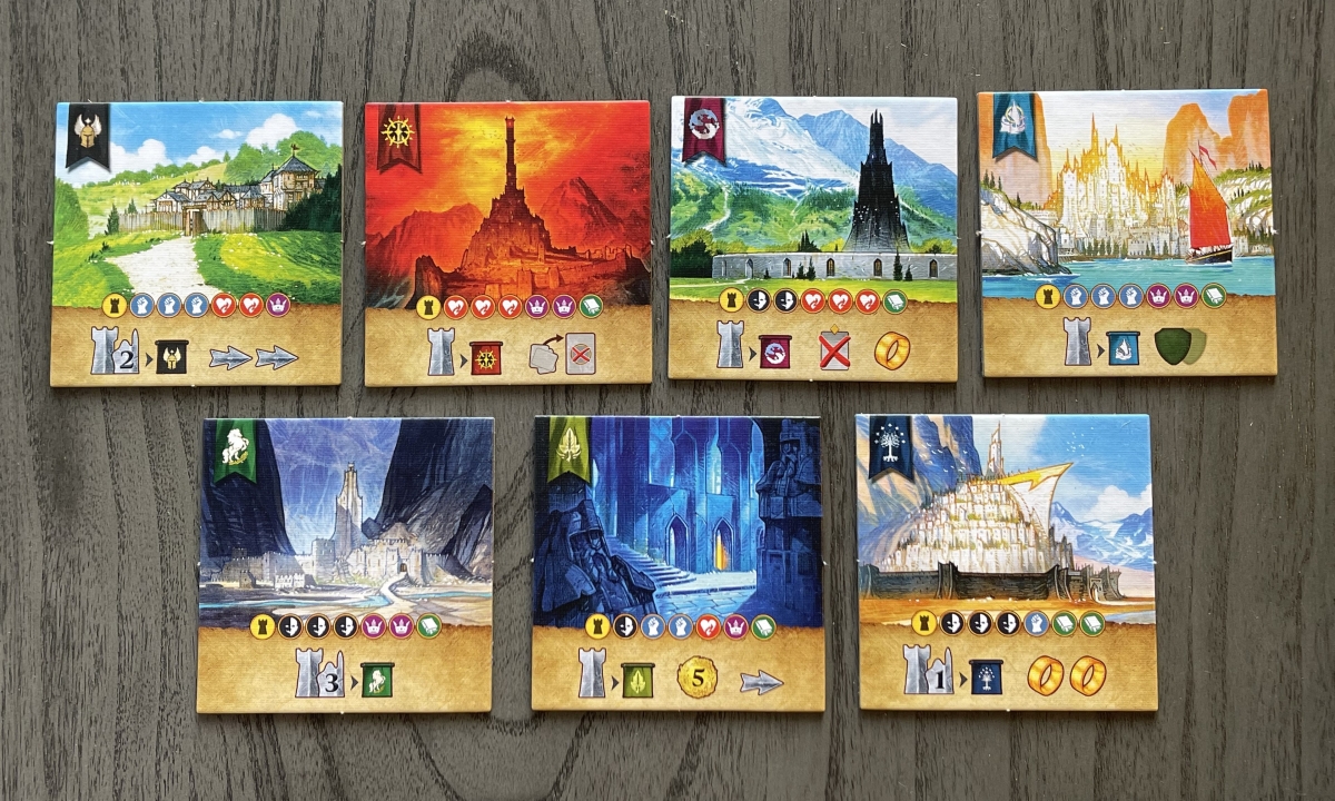 Much like its predecessor 7 Wonders Duel, there are 3 different ways to win the game. Each of these three ways is intrinsically tied into the events of The Lord of the Rings. Over the course of the trilogy, support of the races of Middle-earth are won, battles for domination are fought across the land, and Frodo and Sam try to get the One Ring to Mount Doom while pursued by the forces of Sauron – represented here by the Nazgûl chasing the pair across the Quest of the Ring track.