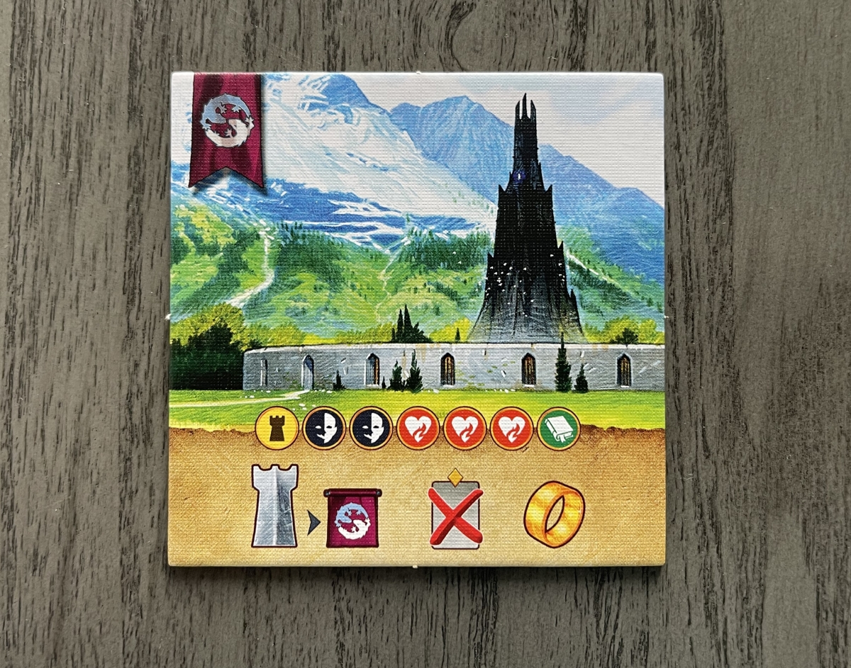 In the example above, the Isengard tile allows you to place a Fortress on Enedwaith, discard a Grey card from your opponent’s play area, and move your character 1 space on the Quest of the Ring track.