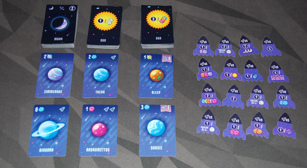 Mix up the rocket tokens and draw a number based on the player count. Place these face-up near the card market and return the rest to the box.