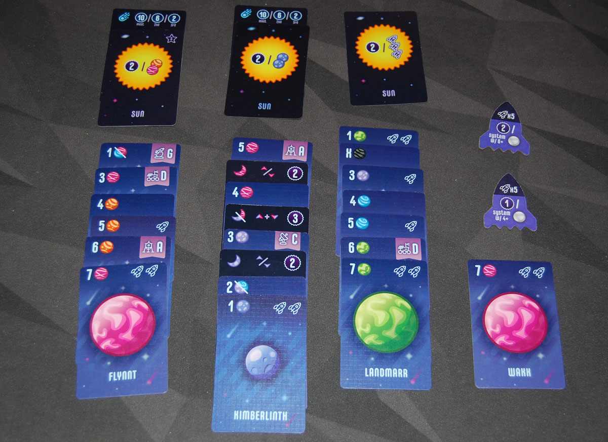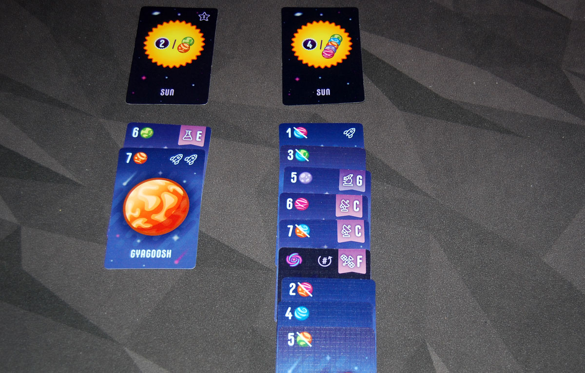 Suns: The sun is placed above the solar system sequence, and will score points for things that are in its solar system. For instance, your starting sun will give you points for each set of two specific colored planets.
