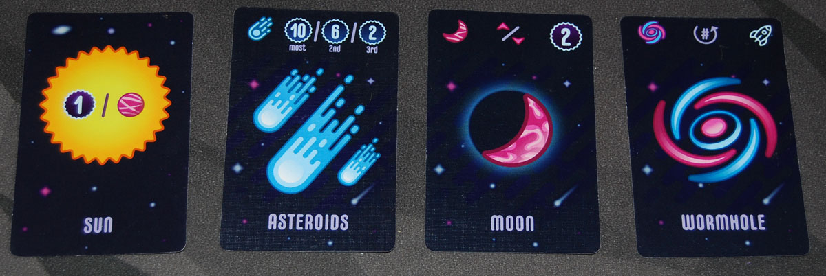 Asteroids: Asteroids must be tucked behind a sun, and each sun card can only have one asteroids card. At the end of the game, asteroids will score points for the players who have the most asteroids cards.