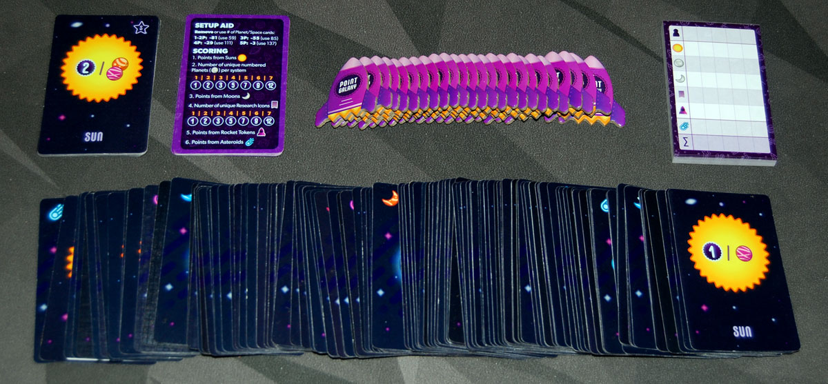Point Galaxy goes back to something more like the original card-drafting (the difference is that you always take two cards no matter where they come from), and the sun cards are a little bit like the original scoring conditions. However, the solar systems mean that you have to organize the cards you collect into groups, which can have various effects on the scoring. The rocket tokens are like the civic tokens from Point City: additional scoring opportunities if you can meet their conditions.