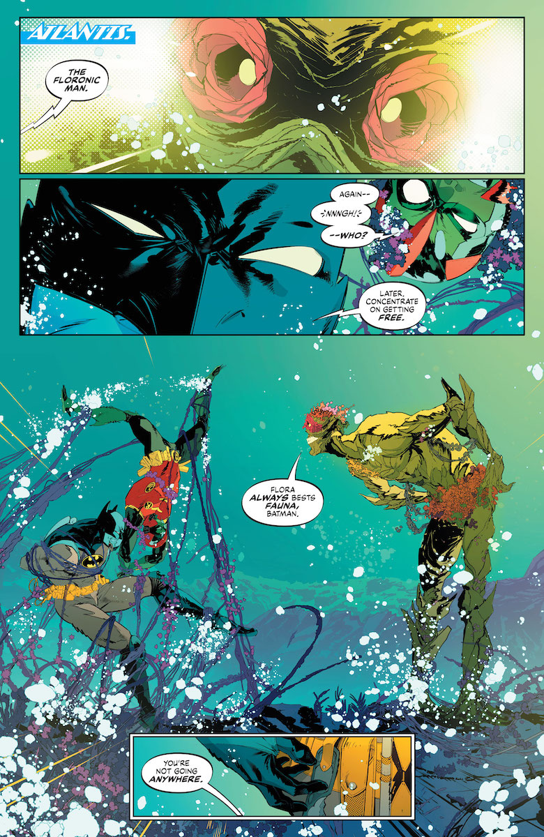 Ray: One of the best things about Mark Waid’s writing is how good he is at combining elements of the DCU that you’d never think would go together. It was the strength of his previous stint on Brave and the Bold, and it carries over into this flashback series. This issue takes us down to Atlantis, which is now composed of two rival cities. Superman and Batman are investigating a strange undersea plague – one that has Aquaman’s city of Poseidonis in a panic, and has the rival city of Tritonis planning for war. King Ronal, Lori Lemaris’ husband, is gung-ho to take over his rivals, and the end of last issue saw the heroes unmask the Floronic Man as the true culprit – but the evil plant-man has thought well ahead and already spread the plague in a way that will maximize. As Aquaman battles to keep his throne and Batman and Robin try to get ahold of Woodrue and get answers for him, Superman finds himself trapped by magic.